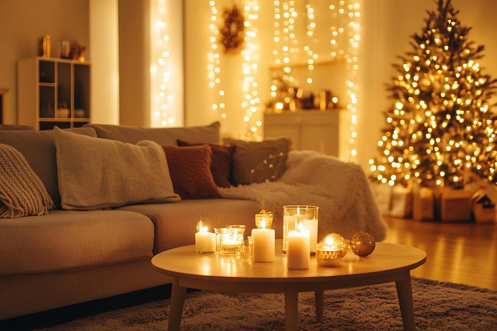 - Accent Light: เพิ่มไฟเส้น (Fairy Lights) ตามต้นไม้และขอบหน้าต่าง โคมไฟผ้าลินิน หรือเทียน LED ตามมุมต่าง ๆ เพื่อให้แสงสว่างมีหลายระดับ ทำให้ห้องมีมิติมากขึ้นและดูอบอุ่นยิ่งขึ้น