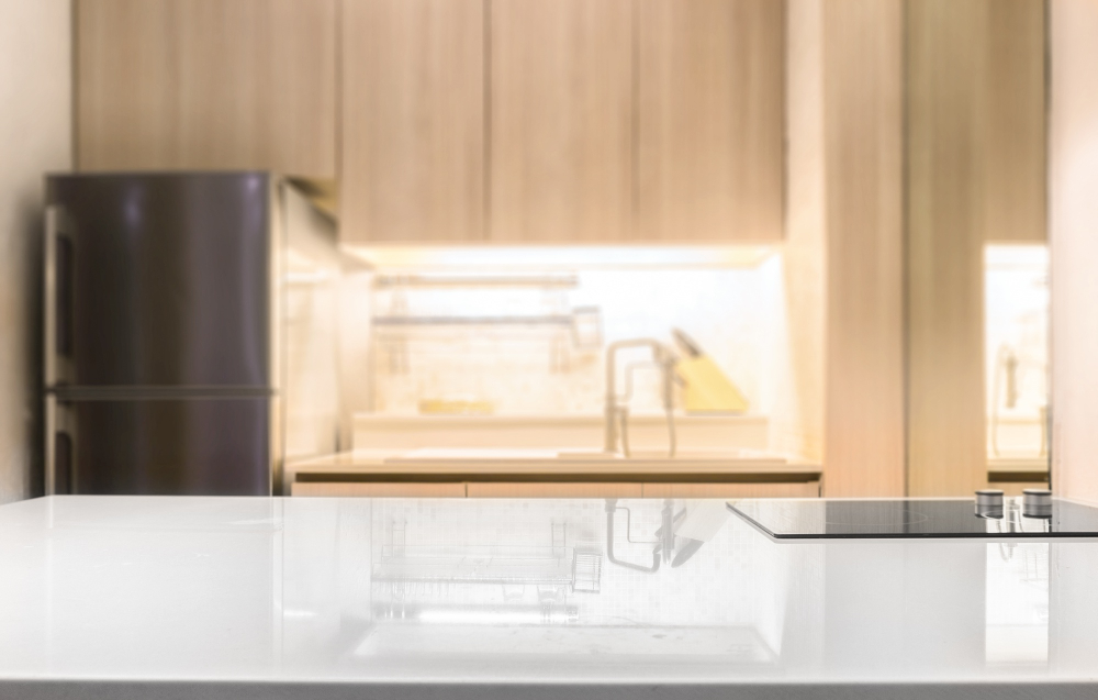 - วัสดุที่แนะนำ: เคาน์เตอร์หินอ่อน/กระเบื้องเคลือบสีอ่อน ตู้ครัวผิว Gloss ไฟ LED ส่องสว่างใต้ตู้ลอย